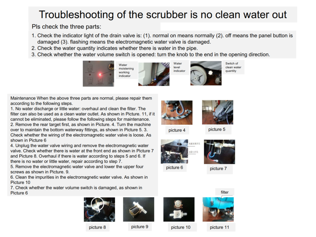 | Water left on floor | Squeegee not lowered | Lower and adjust squeegee |